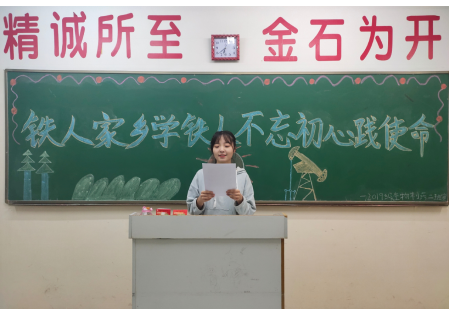 铁人精神,是王进喜同志崇高思想、优秀品德的高度概括,集中体现出中华民族坚持不懈的精神风貌。同学们通过多种表演形式为大家展现了铁人精神对当代大学生的深远影响。朗诵《石油之子》展示出同学们对石油工人的敬佩之情;一首《我爱你中国》抒发出强烈而真挚的爱国主义情感。团支书还向同学们讲解了铁人事迹,希望同学们以铁人榜样,在铁人精神的指引下,不断创新发展、跨越难关。