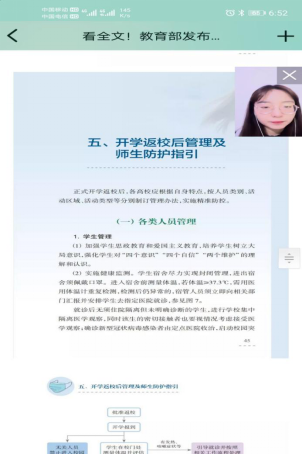 网络班会伊始,团支书介绍了召开此次网络班会的目的,传阅学习了由教育部应对疫情工作领导小组组织编写的《高等学校新型冠状病毒肺炎指导指南》,重点学习了其中关于返校前和途中所应注意的事项,要根据疫情防控形势综合研判,在确保安全的条件下,确定返校日期后,谨遵学校领导安排进行返校,并告知同学们在返校途中的所要注意的防疫措施、到校后接受防疫安排等内容,进一步加强学生的健康安全教育,提高自我防护能力。