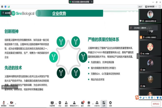 富明利女士首先向同学们介绍了义翘神州的基本概况:北京义翘神州科技股份有限公司作为国家高新技术企业,主要从事生物试剂研发、生产、销售并提供技术服务的生物科技公司,主要业务包括重组蛋白、抗体、基因和培养基等产品,以及重组蛋白、抗体的开发和生物分析检测等服务,同时也为制药公司或者生物技术公司提供单克隆抗体候选药物的临床前规模生产服务。该公司拥有多项先进的核心技术以及从研发生产到放大生产的技术平台。