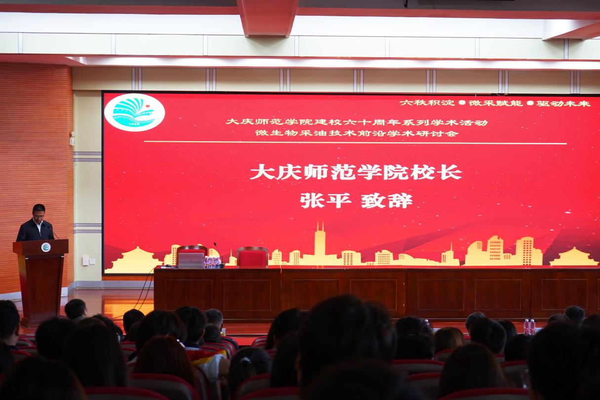校长张平教授出席开幕式并致辞。张平校长对各位专家、学者和嘉宾的到来表示热烈的欢迎。张平校长指出,我校紧密对接黑龙江省“4567”产业布局及大庆市“1357”现代化产业体系,在生物经济、油气采掘和现代生物等领域取得了阶段性成果,重点介绍了我校在微生物采油、微生物解堵、微生物腐蚀、微生物油泥处理以及微生物水处理等方面取得的研究成果。