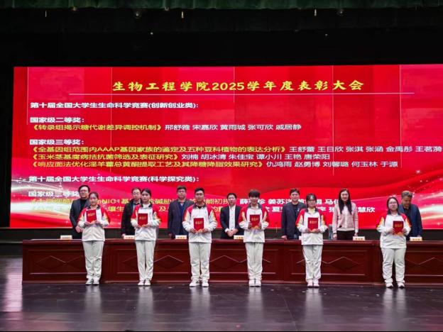 大会回顾了过去一年在学术与竞赛领域取得的丰硕成果。尤为振奋人心的是,我院学子在全国大学生生命科学竞赛(科学探究类)中勇夺国家级一等奖,这一重大突破充分展现了我院在科学探究领域的扎实功底。与此同时,我院还斩获了第十届全国大学生生命科学竞赛(创新创业类)、中国国际大学生创新大赛(2025)省级铜奖等多个重要奖项,全面彰显了我院学子扎实的科研素养与卓越的创新能力。为表彰先进、树立典范,大会特别为过去一年表现突出的学子颁发荣誉证书。张淑萍、曹宏妍、熊文丹等十名同学凭借卓越表现,被授予“十大学习标兵”荣誉称号,充分肯定了他们在学业与科研道路上的模范引领作用。这些成绩的取得,特别是全国大学生生命科学竞赛(科学探究类)国家级一等奖的突破,标志着我院在创新人才培养方面取得了新的重要进展。
